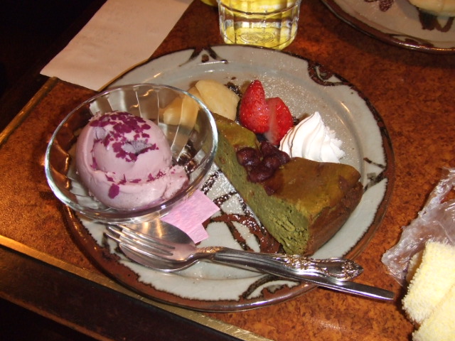 抹茶チーズケーキと、紅いもアイス、そしてジャスミンティーという訳のわからん組み合わせを頼みました。